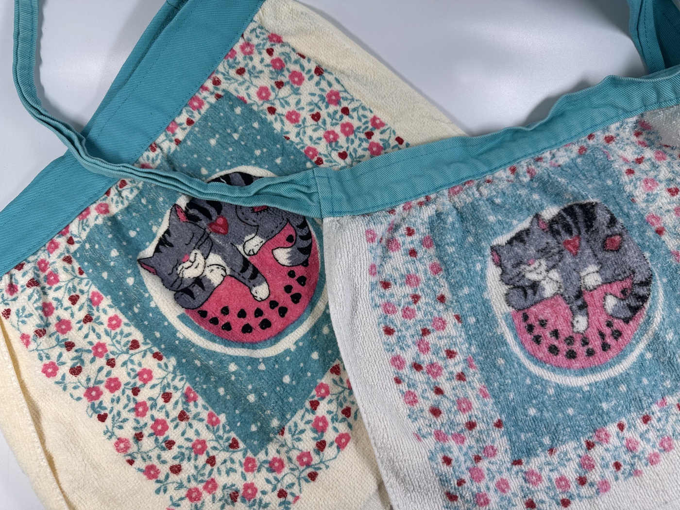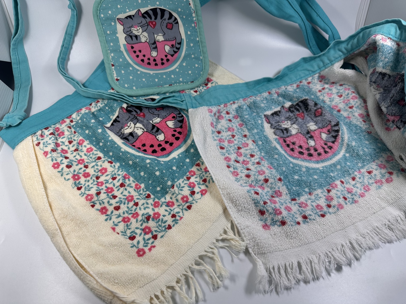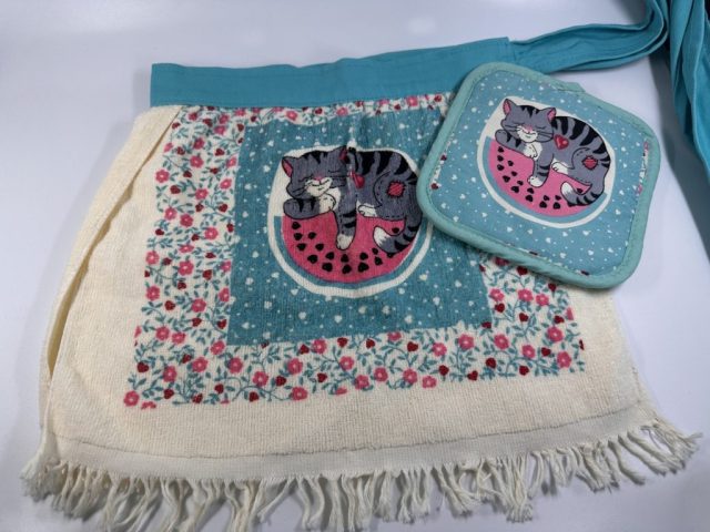 Our first customer has been using her handy aprons since the mid 90s! Still in use after 30 years, Terri brought us her set of vintage Handy Aprons to photography. She even has a vintage Handy Apron that was never used. There is a photo of it in the photo gallery below, also picture next to the same design of a 30+ year old Handy Apron with the same design.