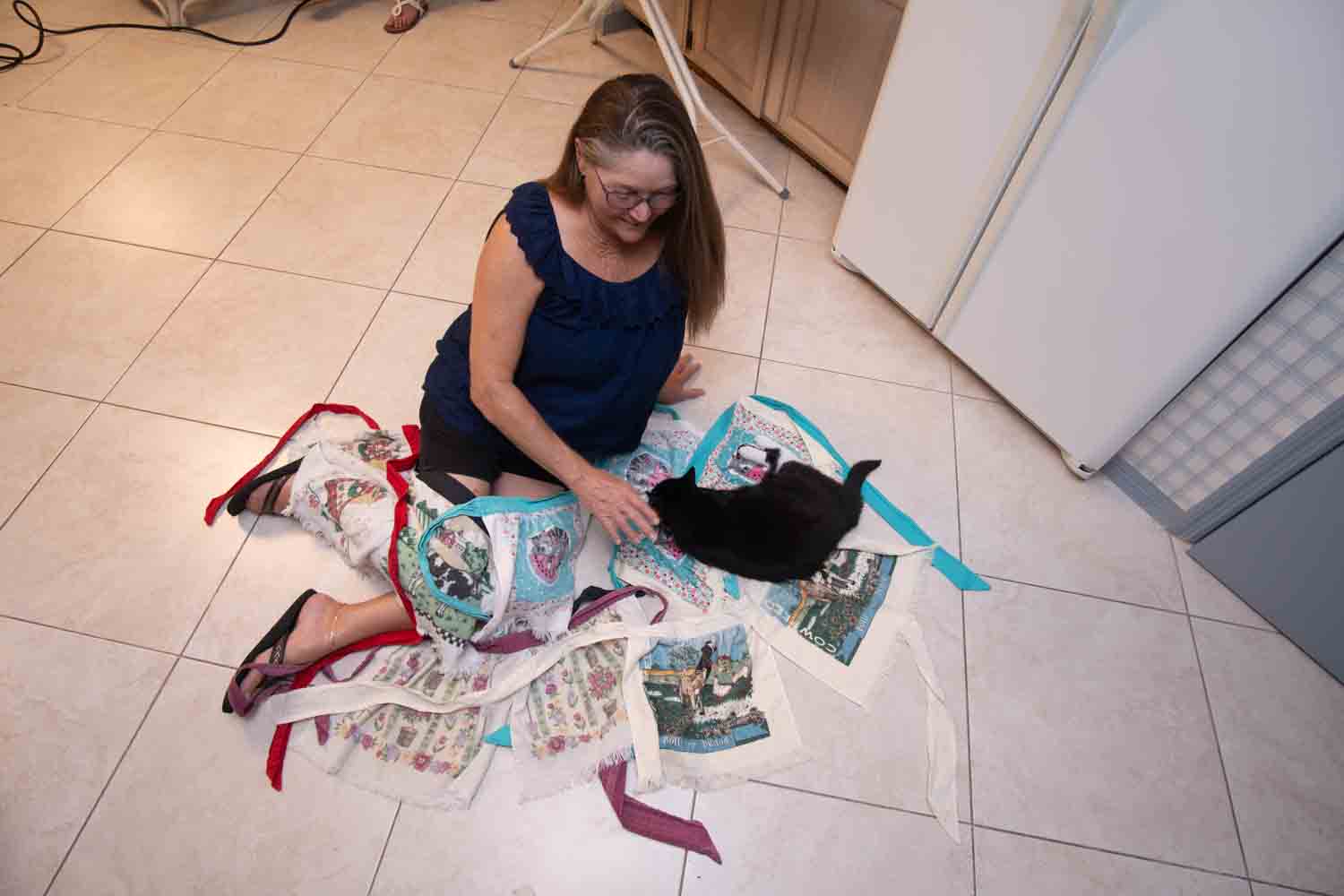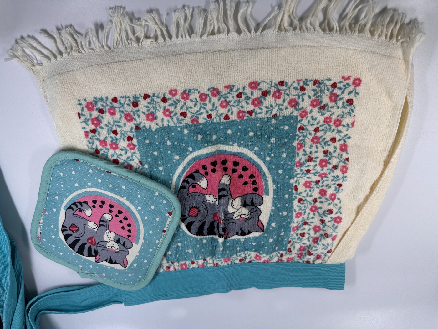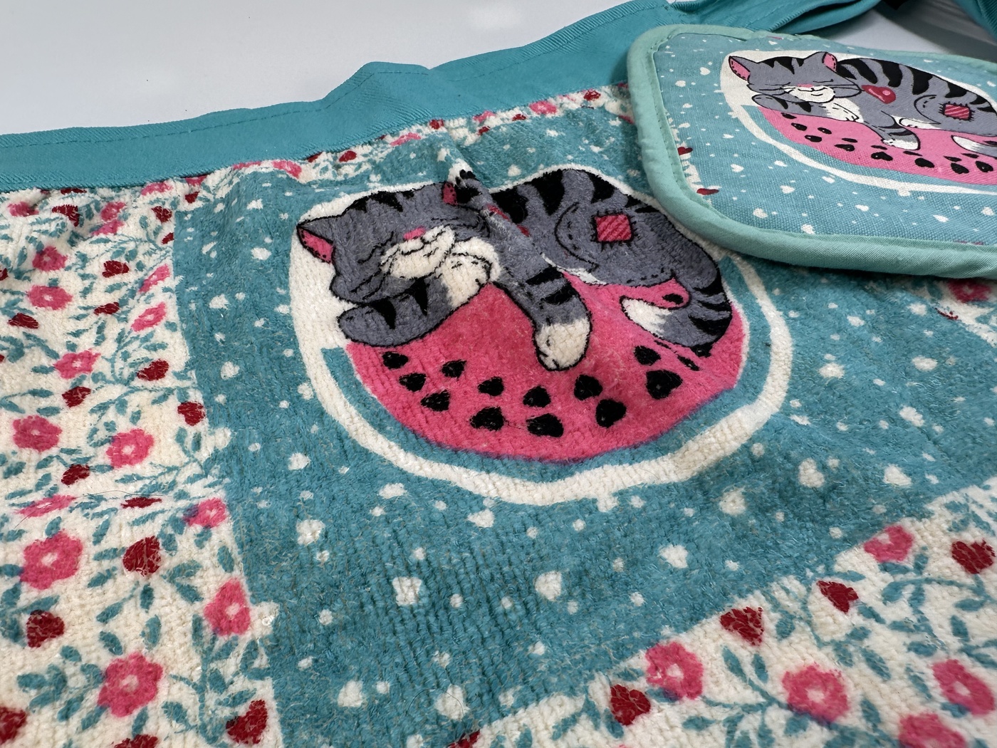 Our first customer has been using her handy aprons since the mid 90s! Still in use after 30 years, Terri brought us her set of vintage Handy Aprons to photography. She even has a vintage Handy Apron that was never used. There is a photo of it in the photo gallery below, also picture next to the same design of a 30+ year old Handy Apron with the same design.